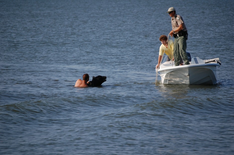 Hvis en søt liten hund holdt på å drukne, hva ville du gjort? Sannsynligvis hoppet uti og reddet livet hans, sant? Vel, hvis offeret var en 180 kg tung bjørn… Hva ville du gjort da?