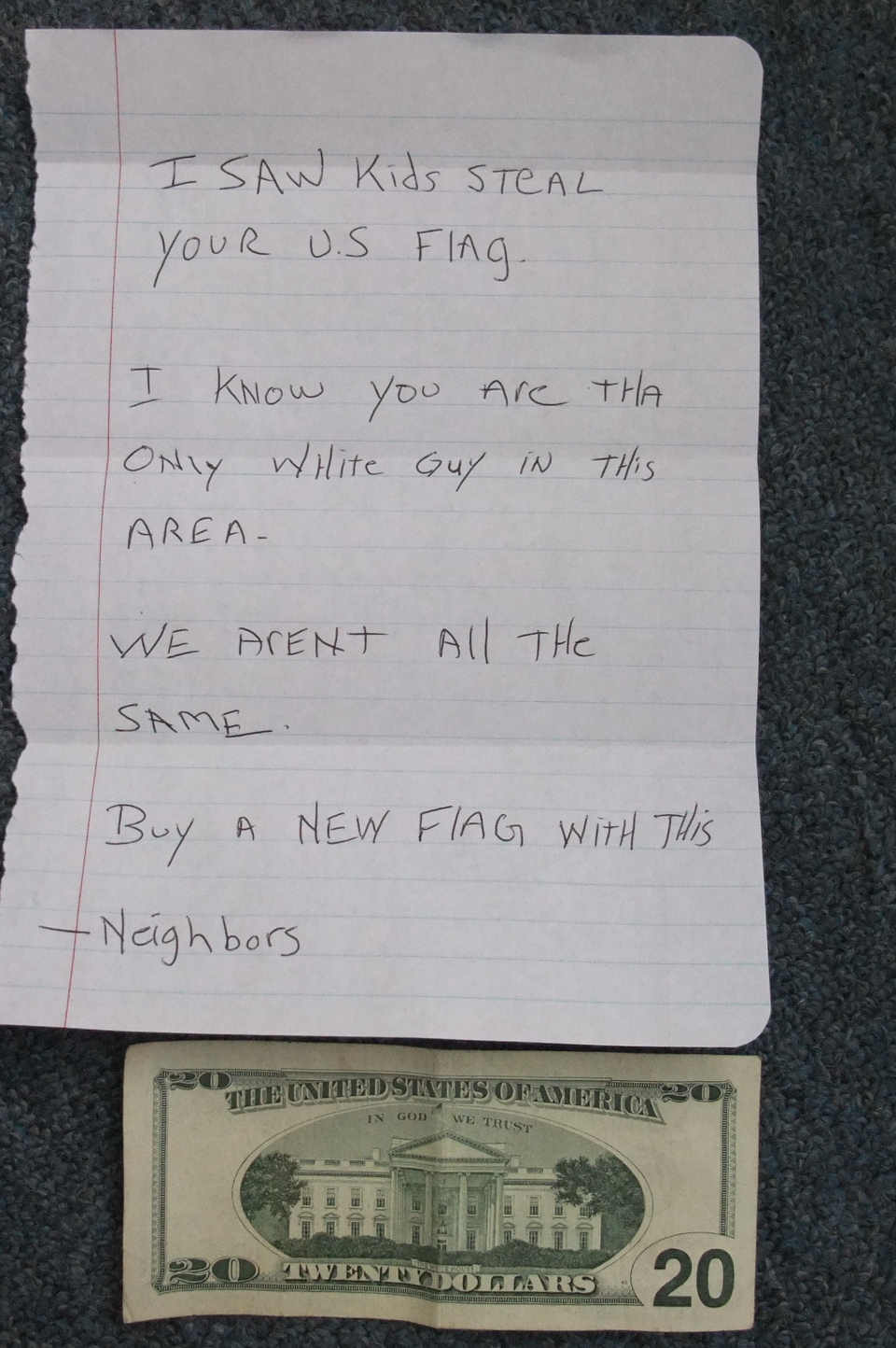 Da Reddit-bruker XminusOne flyttet inn i et nytt nabolag, la han merke til at han var den eneste hvite personen der. Det tok ikke lange tiden før hans amerikanske flagg ble stjålet… Men så fant han dette notatet på bilen sin.