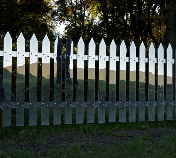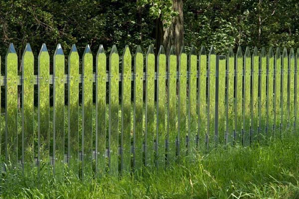 Alyson er en kunstner som har spesialisert seg i å lage store skulpturelle stykker som er knyttet til sine omgivelser. I dette tilfellet skapte hun et gjerde som speiler verden rundt seg. Det blander seg nesten perfekt inn med gress, trær og åser i det fjerne. Speilgjerdet er like vakkert som den er villedende.